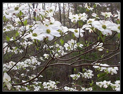 Blooming dogwood trees look as if they are covered by snow in the spring.